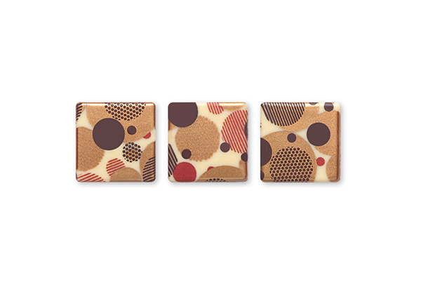 Este azulejo de chocolate blanco destaca por su diseño moderno y llamativo, con una combinación de colores de impresión en tonos marrón, cobre y rojo-rubí.