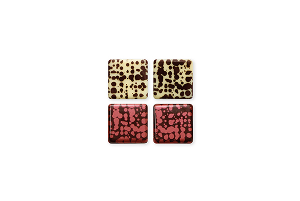 Cuadrados de chocolate negro y blanco surtidos con una serigrafía alimentaria en superficie de color rojo brillante y marrón.